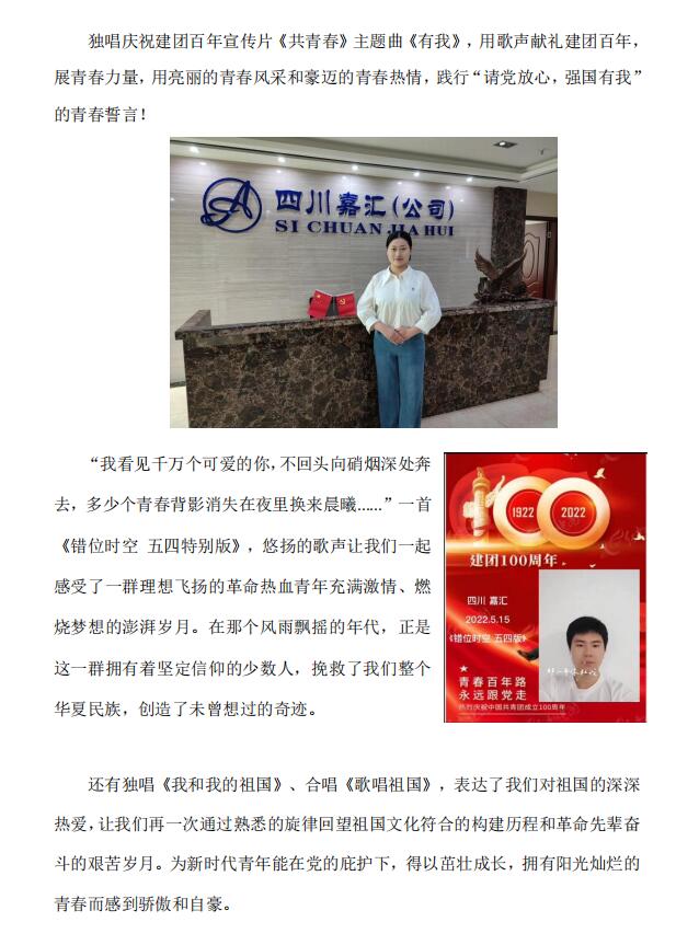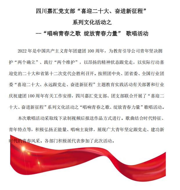 四川嘉匯黨支部“喜迎二十大、奮進(jìn)新征程” 系列文化活動(dòng)之 --“唱響青春之歌 綻放青春力量” 歌唱活動(dòng)