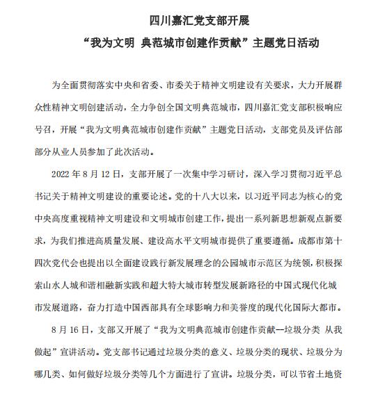 四川嘉匯黨支部開展 “我為文明 典范城市創(chuàng)建作貢獻”主題黨日活動