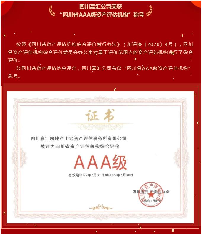 四川嘉匯公司榮獲“四川省AAA級資產評估機構”稱號!
