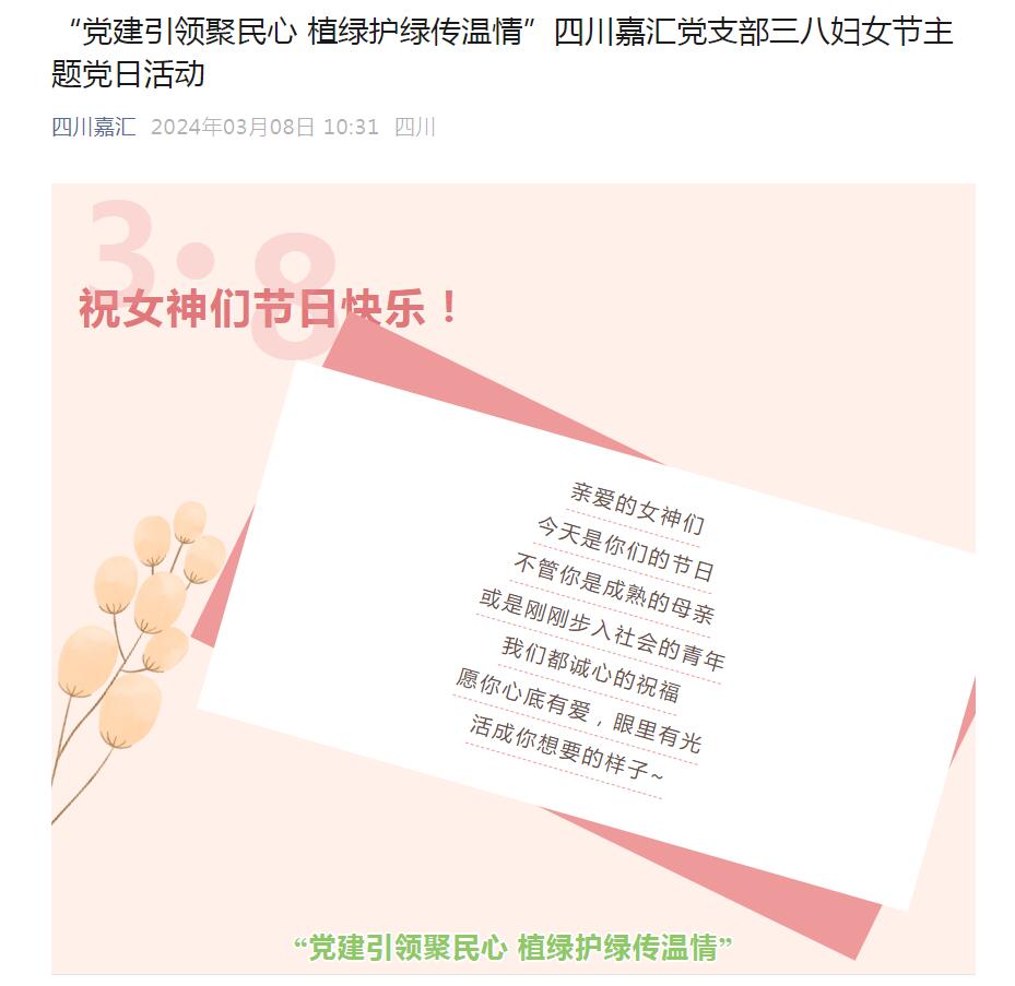 “黨建引領(lǐng)聚民心植綠護(hù)綠傳溫情”四川嘉匯黨支部三八婦女節(jié)主題黨日活動