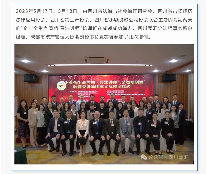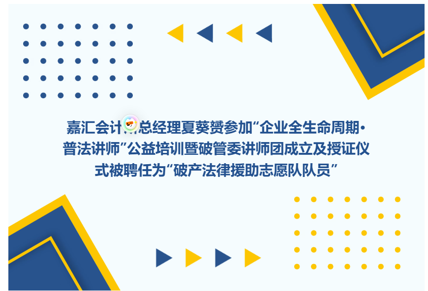 嘉匯會(huì)計(jì)所總經(jīng)理夏葵赟參加“企業(yè)全生命周期·普法講師”公益培訓(xùn),被聘任為“破產(chǎn)法律援助志愿隊(duì)隊(duì)員”